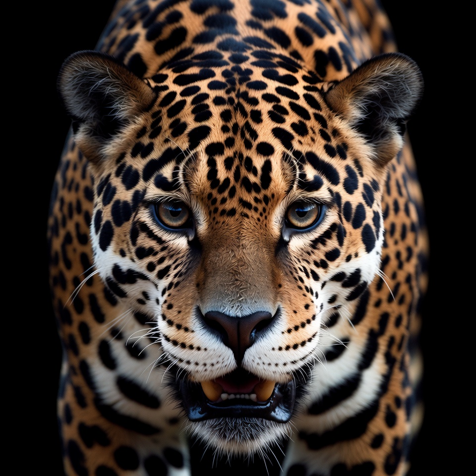 big cat, black background, blue eyes, close-up, ears, felidae, golden fur, intense stare, mammal, portrait, predator, rosettes, sharp fangs, spots, whiskers, wild animal, wildlife, jaguar