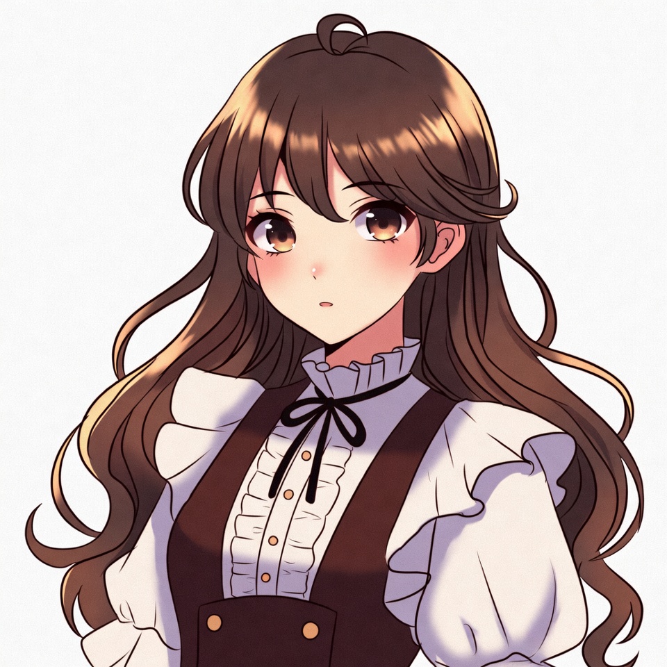 An anime-style illustration of a young woman with long brown hair and large expressive eyes. She wears a white blouse with ruffled collar and cuffs, topped by a black vest with bow tie. She faces forward with a slight blush on a plain background.