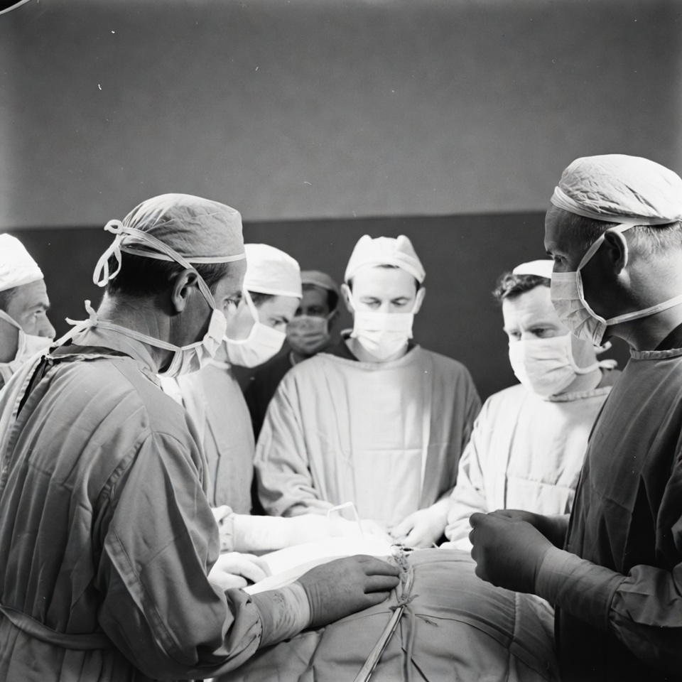 A group of male surgeons wearing surgical masks and caps stands around an operating table in a hospital room. They are dressed in scrubs and focused on a patient covered by a sheet. The black and white photograph captures the medical team during surgery.