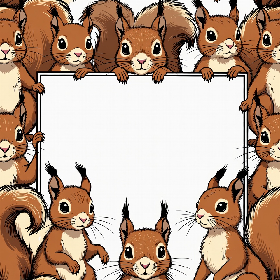 A group of cartoon squirrels with fluffy tails surrounds a large white blank sign. They peek over the edges with big expressive eyes and cheerful expressions. The illustration features reddish-brown fur and is set against an isolated white background.