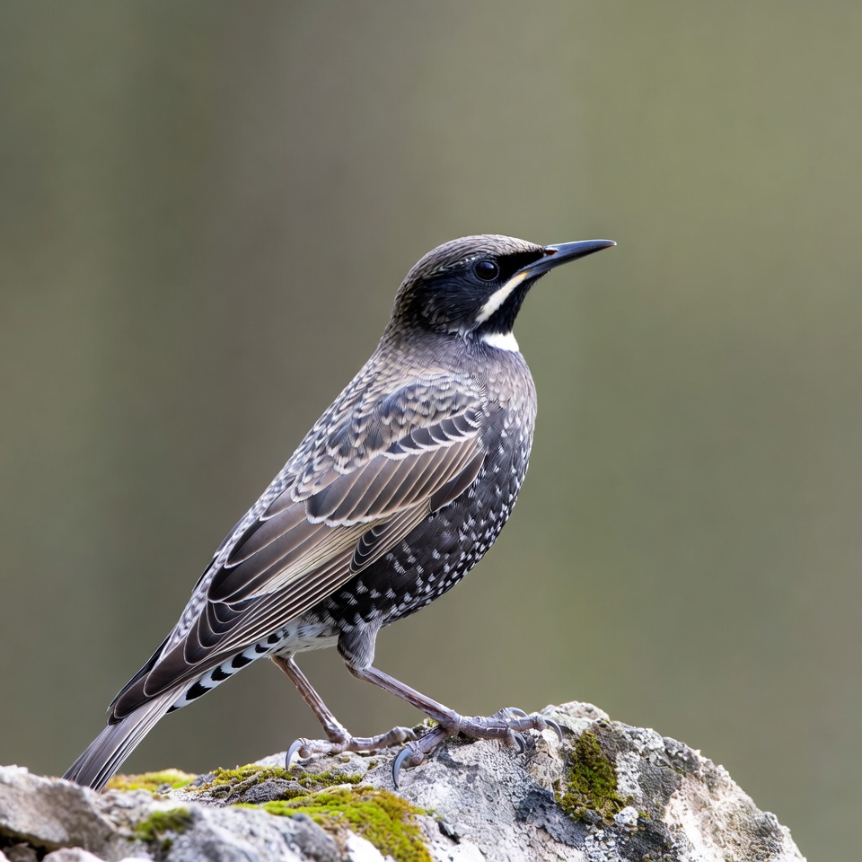avian, bird, brown bird, feathers, green background, moss, mossy rock, nature, perched bird, rock, songbird, speckled feathers, white eye stripe, wildlife, wings, yellow beak, starling
