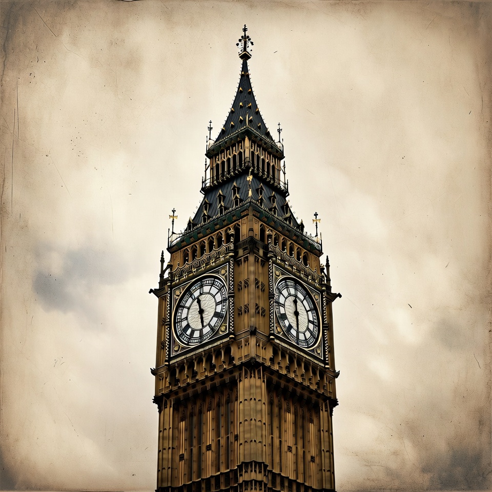 England icon, Gothic architecture, London landmark, clock faces, clock tower, cloudy sky, historic building, landmark photo, ornate spires, sepia tone, tall tower, urban architecture, vintage filter, white clocks, Big Ben