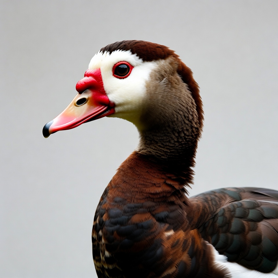 avian, bird, brown feathers, close-up, crest, duck, feathers, isolated background, poultry, profile view, red bill, red caruncle, waterfowl, white eye, white feathers, wildlife, Muscovy duck