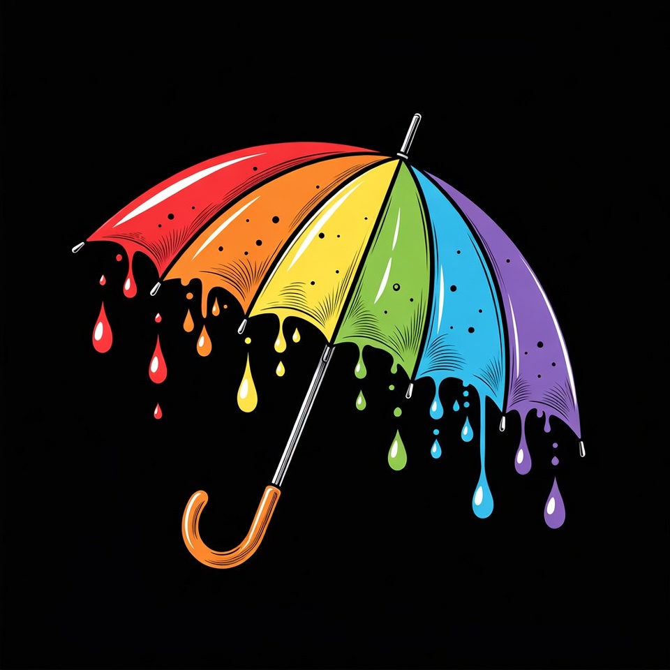 artistic umbrella, black background, clipart, colorful rain, colorful umbrella, dripping colors, graphic design, green blue purple, hand drawn, illustration, isolated background, open umbrella, paint drips, pride umbrella, rainbow colors, red orange yellow, umbrella illustration, vector art, vibrant umbrella, rainbow umbrella