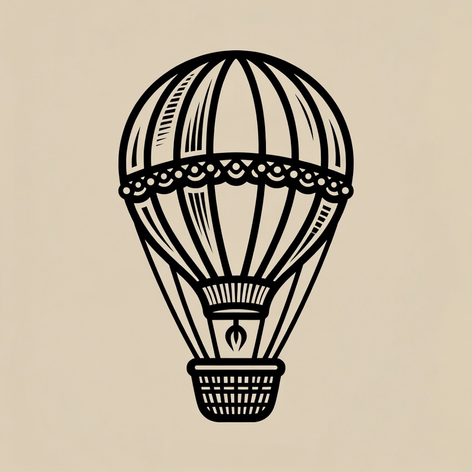 A black line art illustration of a hot air balloon on a beige background. The balloon features detailed striped patterns and ornate edging on the top. A basket with a flame hangs below the balloon envelope.