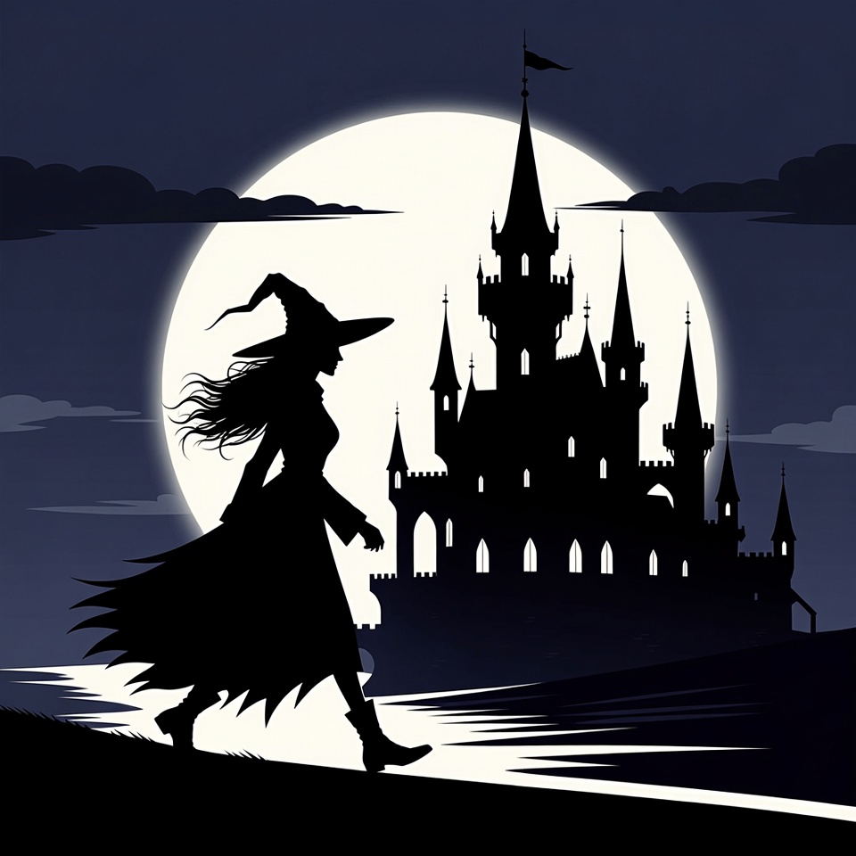 A black silhouette of a witch with a pointed hat and flowing dress walks toward a tall, gothic castle under a large full moon. The scene features dark clouds, a flag atop the castle, and grassy terrain near water. The illustration uses stark contrast against a night sky background.