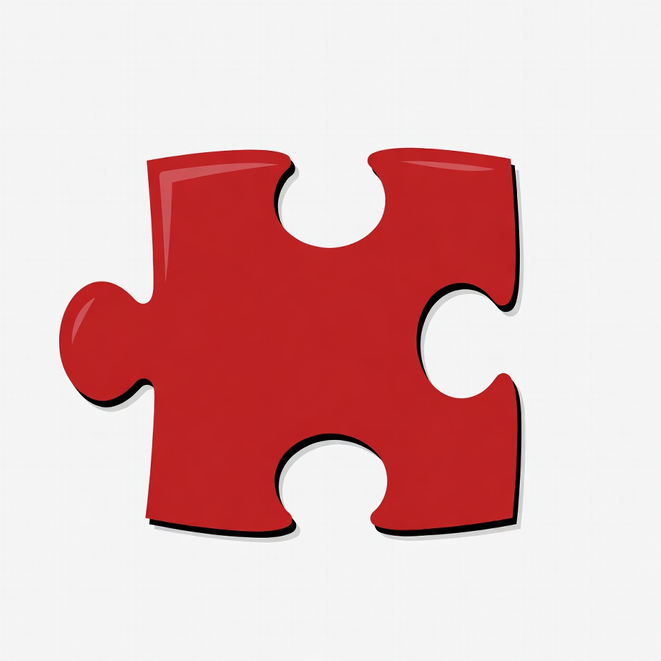 A single red jigsaw puzzle piece with tabs and blanks is isolated on a white background. The piece features a glossy, cartoonish illustration style with smooth curves and bold outlines.