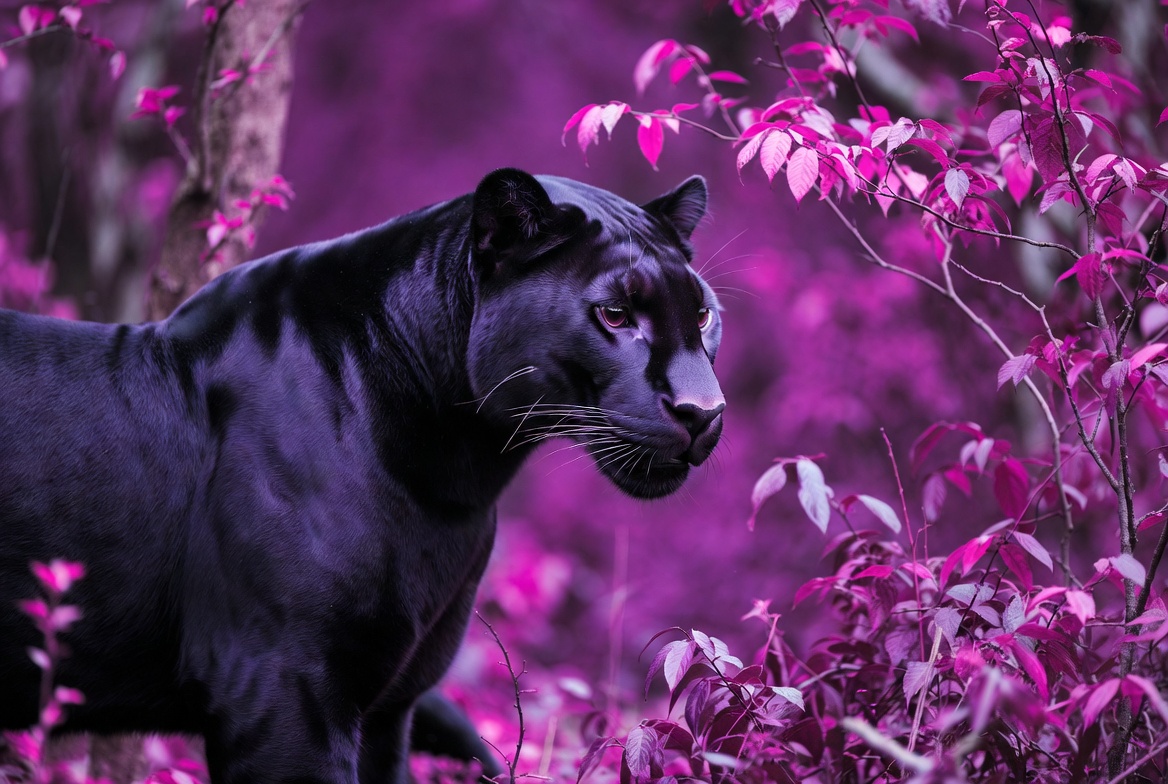 A sleek black panther stands amid vibrant purple foliage and trees. Its glossy fur contrasts sharply with the neon pink and purple leaves surrounding it. The panther gazes to the side with intense yellow eyes.