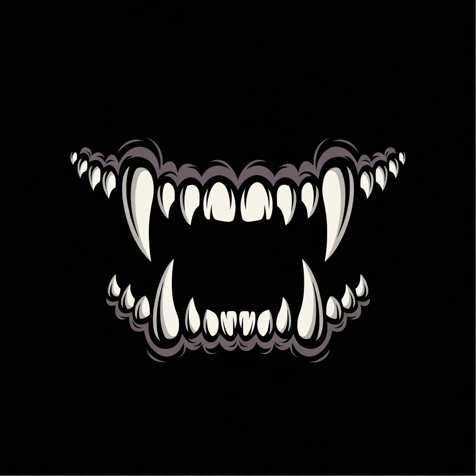 A detailed black and white illustration of sharp fangs bared in an open mouth. The fangs are prominently white with pointed tips, surrounded by dark gray teeth and gums. The design is isolated on a solid black background.