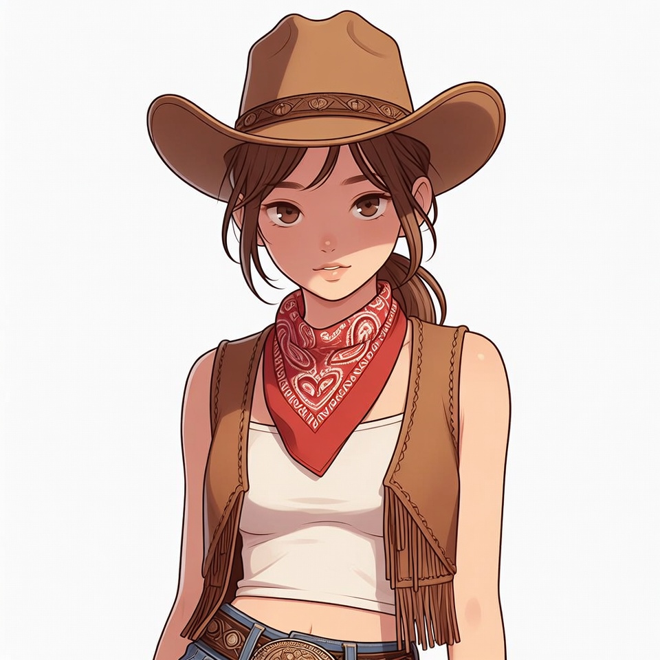 Asian, belt buckle, brown hat, cartoon, cowboy hat, cowgirl, dark hair, denim shorts, female, fringe details, fringed vest, illustration, isolated background, ponytail, red bandana, western style, white tank top, young woman, anime girl