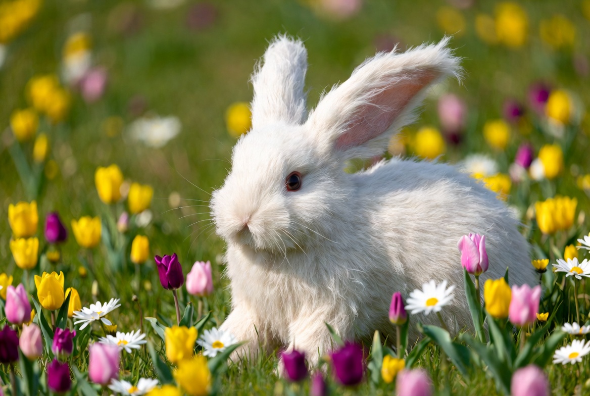 animal, bunny rabbit, cute bunny, daisies, field, flowers, fluffy fur, garden, grass, isolated background, long ears, pet rabbit, pink tulips, purple tulips, rabbit, spring, tulips, yellow tulips, white bunny