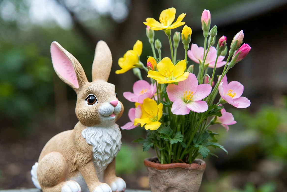 A small tan bunny figurine with long ears and a white chest sits next to a terracotta pot of vibrant flowers. The flowers include clusters of yellow and pink blooms on green stems. The scene is set against a blurred outdoor garden background.