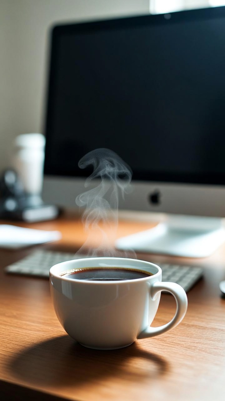 A white ceramic mug filled with hot black coffee emits steam on a wooden desk. An Apple computer monitor, keyboard, papers, and a white to-go cup are visible in the background. The setup appears to be a modern office workspace.