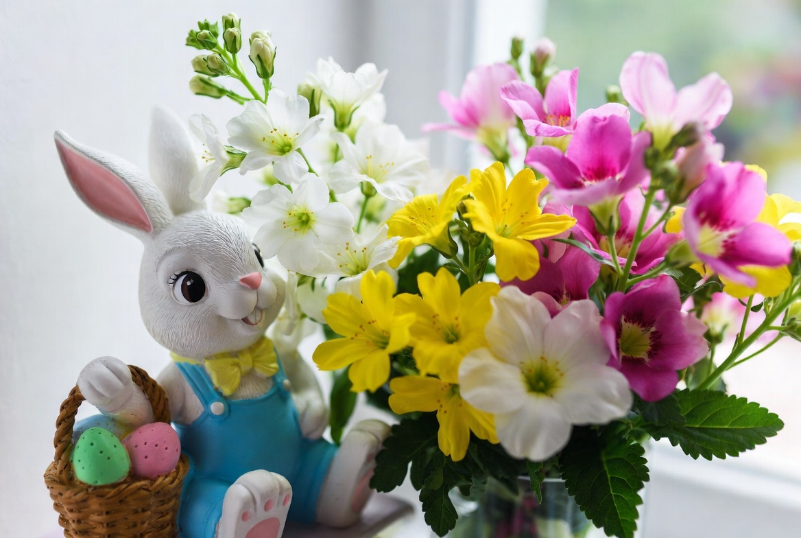 Easter eggs, basket, blue overalls, bunny, colorful flowers, cute bunny, figurine, flowers, holiday decoration, isolated background, pink flowers, rabbit, spring flowers, toy bunny, vase, white bunny, white flowers, window background, yellow flowers, Easter bunny