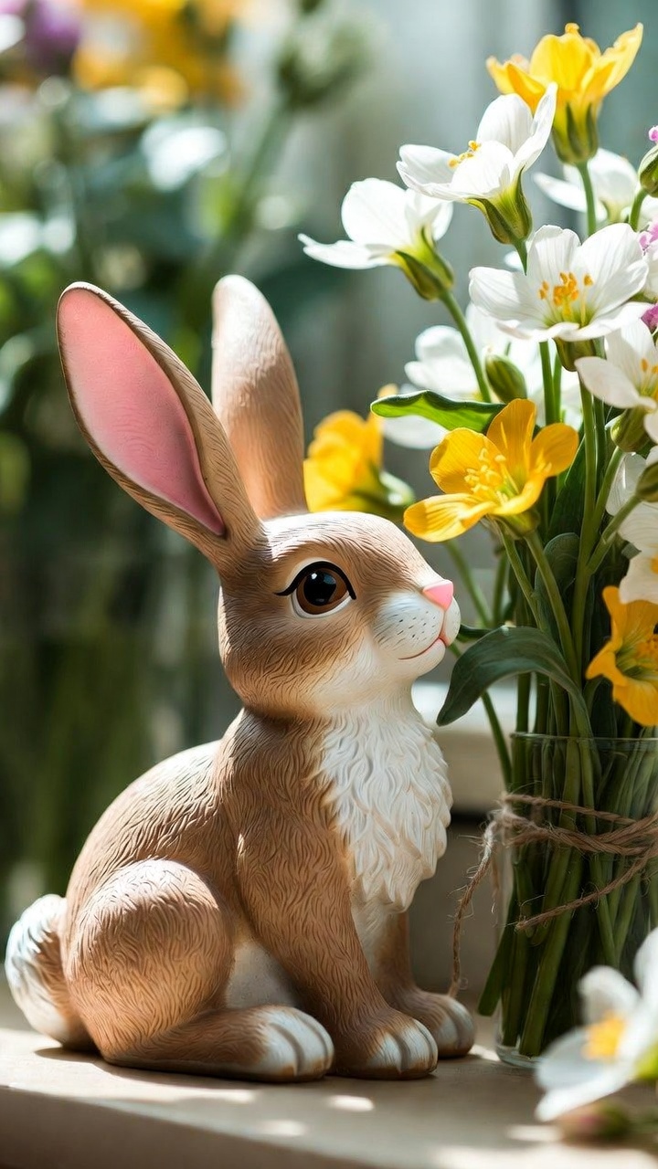Easter bunny, animal, bouquet, brown rabbit, cute bunny, figurine, flowers, isolated background, petals, pink ears, rabbit, sitting rabbit, white flowers, yellow flowers, bunny