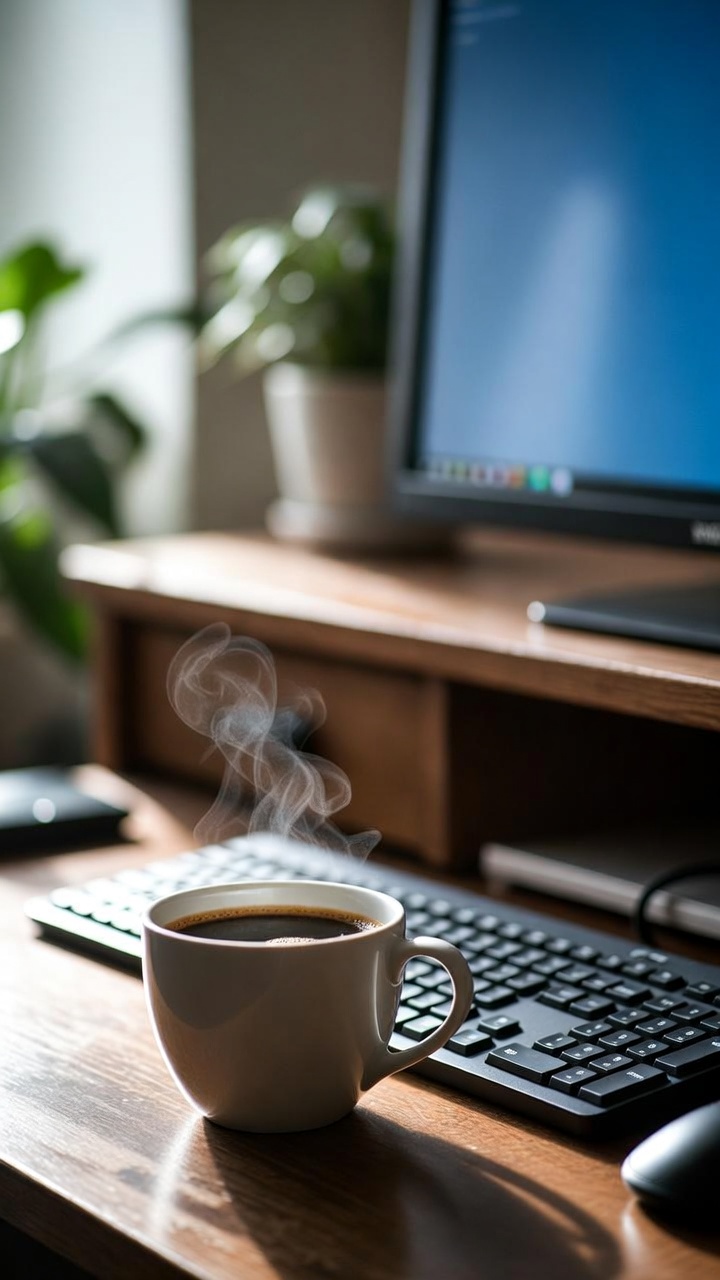 black coffee, computer monitor, desk, green plants, home office, keyboard, morning coffee, mouse, office desk, potted plants, steaming coffee, sunlight, window, wooden desk, workspace, coffee cup