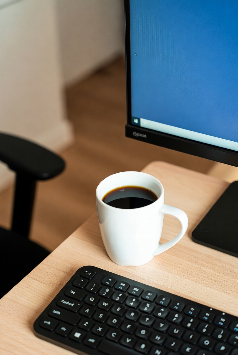 black coffee, blue screen, coffee break, computer desk, computer monitor, desk, desk accessories, empty office, ergonomic chair, home office, keyboard, keyboard closeup, modern office, monitor display, monitor screen, mug of coffee, office chair, office setup, white mug, wooden desk, work desk, workspace, coffee mug