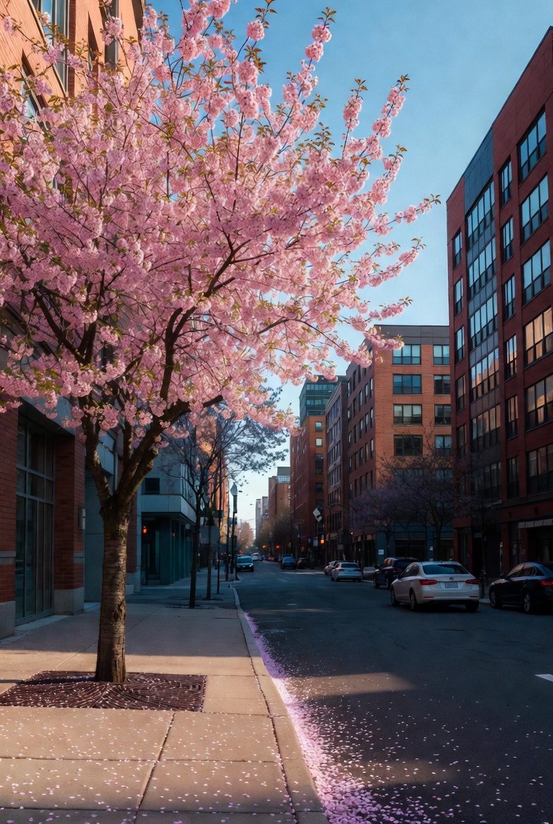 blossom tree, blue sky, brick buildings, city sidewalk, cityscape, fallen petals, modern architecture, parked cars, pink flowers, sakura tree, sidewalk, spring, street trees, urban street, cherry blossom