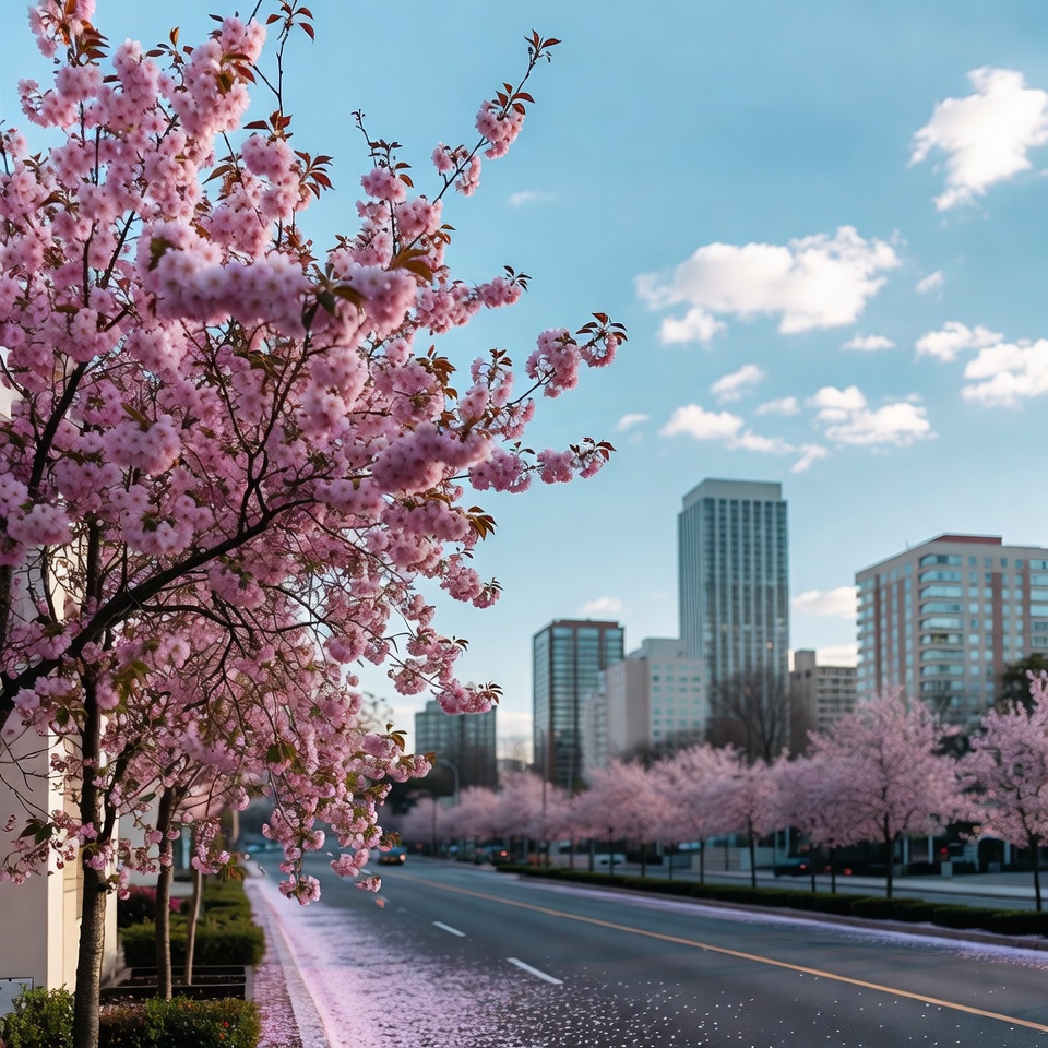 bloom, blue sky, boulevard, city street, cityscape, clouds, fallen petals, high-rise buildings, modern architecture, nature, pathway, pink flowers, road, sakura trees, sidewalk, skyscrapers, spring, trees, urban landscape, cherry blossoms