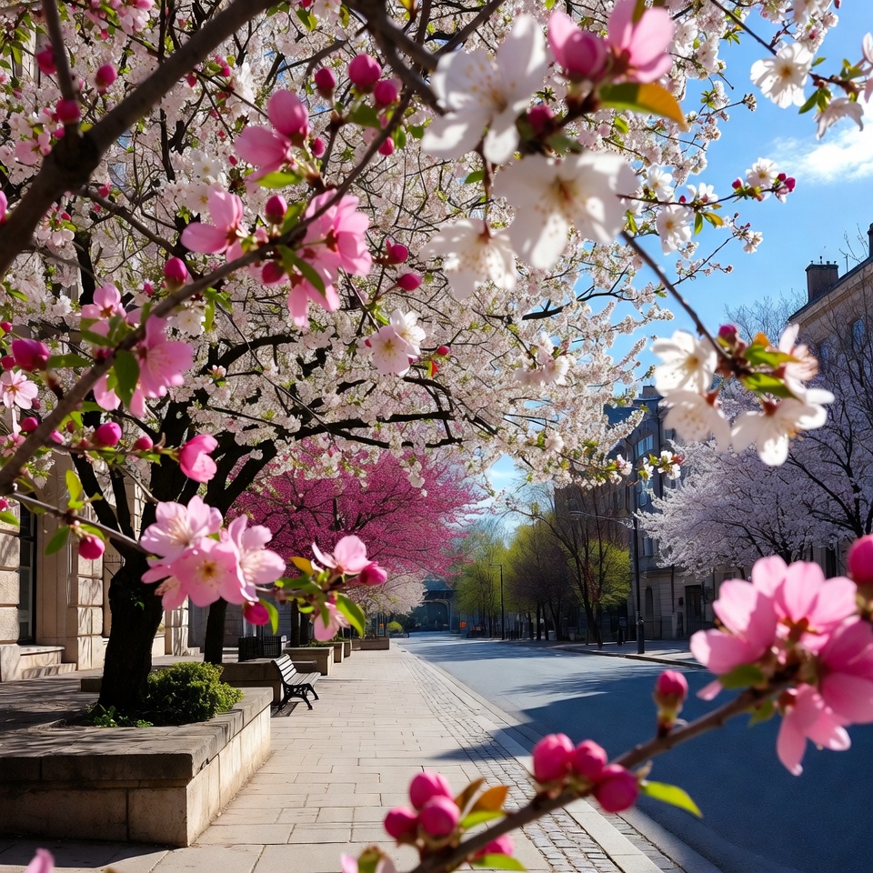 A cherry blossom tree with vibrant pink and white flowers overhangs a quiet cobblestone street. The scene features blooming branches in the foreground, a bench, stone buildings, and a blue sky in the background. Sunlight filters through the petals, highlighting the springtime urban landscape.