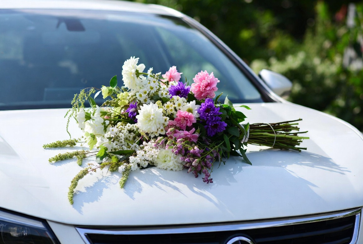 A vibrant bouquet of white, pink, and purple flowers rests on the hood of a shiny white car. The flowers include dahlias, delphiniums, and greenery, tied with string. The car is parked outdoors with green foliage in the blurred background.