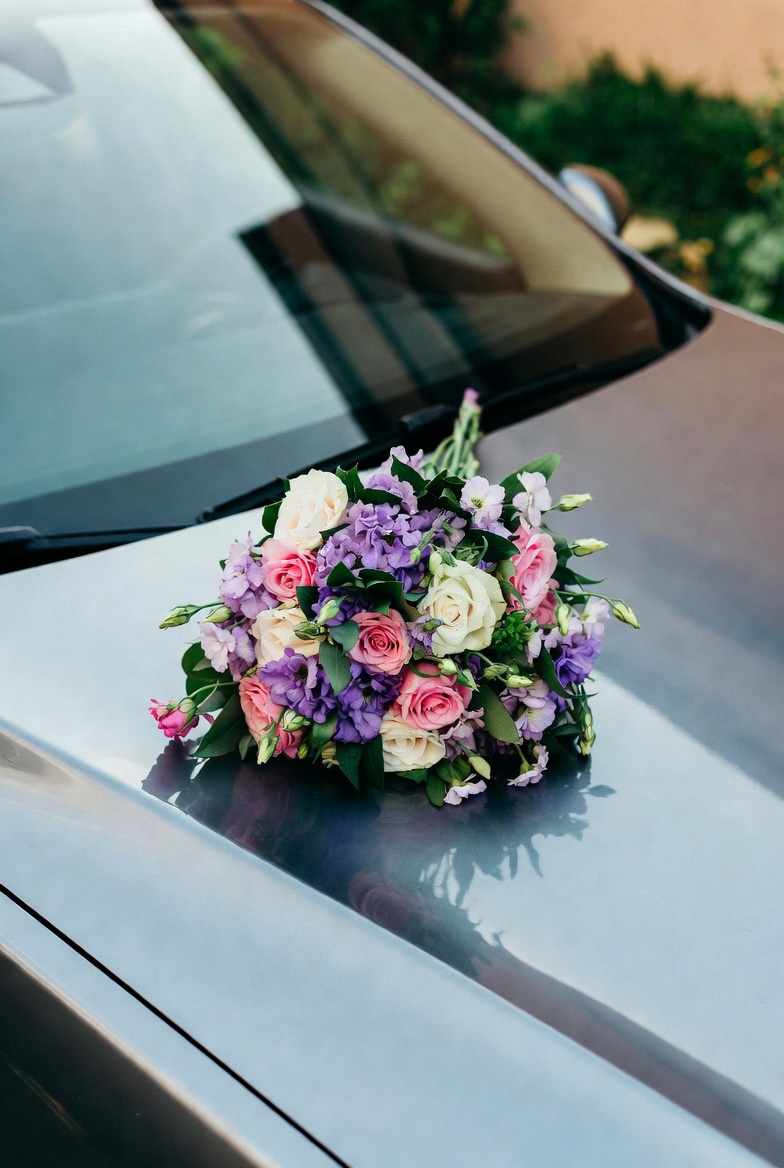 A vibrant bouquet of pink, white, and purple flowers rests on the hood of a dark gray car. The car is parked outdoors with green bushes and a beige wall in the background. Reflections on the shiny car surface highlight the bouquet's delicate petals and stems.