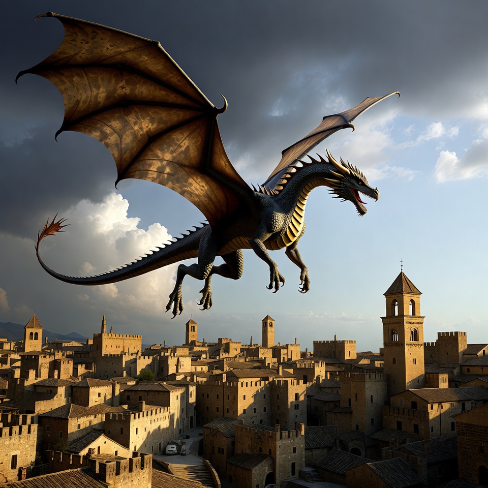 A large black dragon with brown wings and golden accents flies menacingly over a terracotta-roofed medieval village. The scene features tall bell towers and clustered stone buildings under a cloudy sky. The dragon's claws are extended and mouth open in a roar.