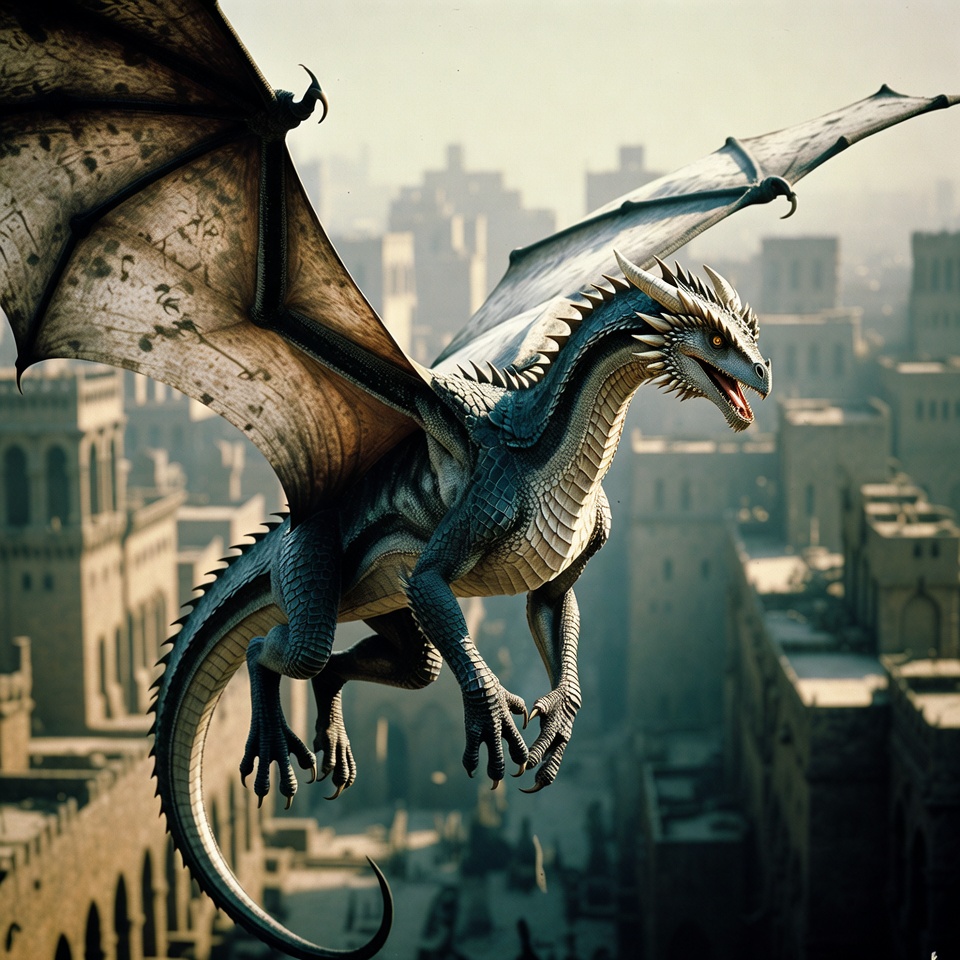 Dragon flying over ancient city