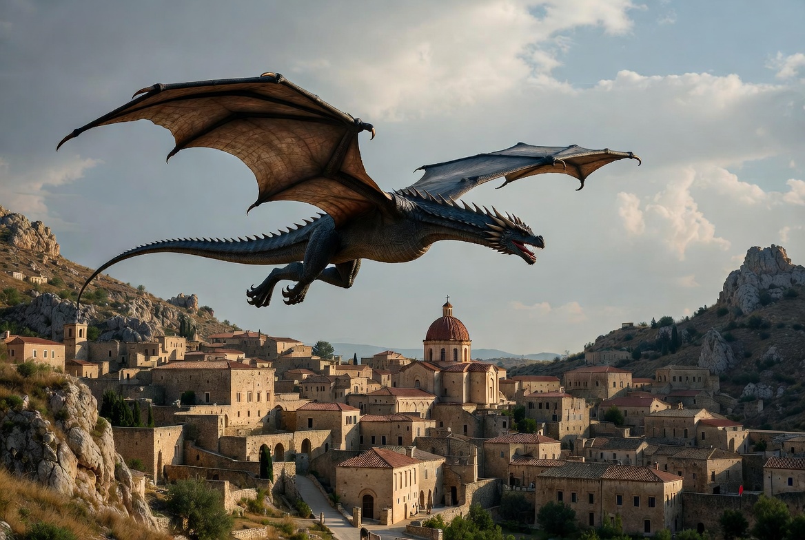 A large black dragon with outstretched wings flies over a medieval stone village built on rocky cliffs. The village features terracotta-roofed buildings and a prominent domed church. The scene is set against a partly cloudy sky with mountains in the background.
