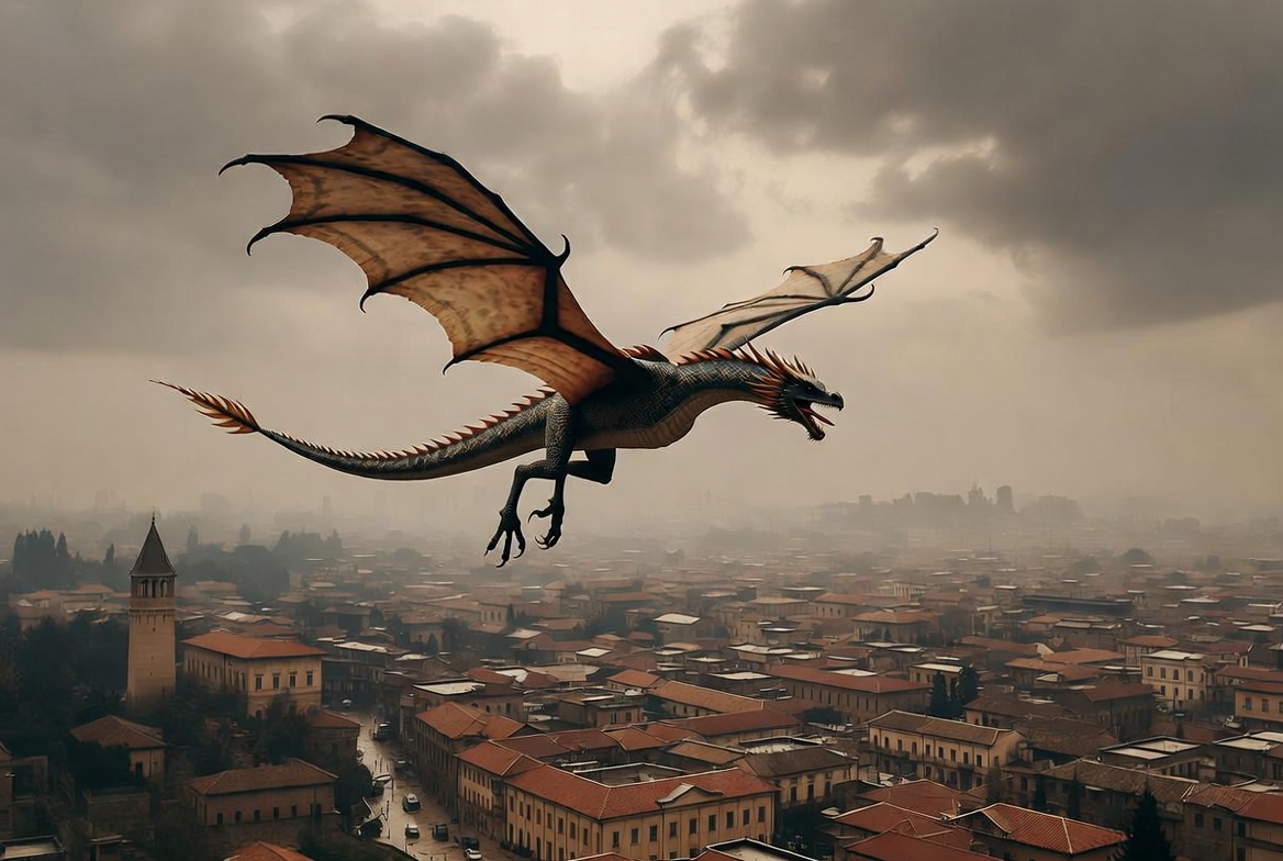 airborne dragon, ancient city, cityscape, claws, fantasy creature, fantasy dragon, flying dragon, foggy city, gray dragon, medieval city, mythical beast, narrow streets, orange dragon, scales, storm clouds, terracotta roofs, tower, wings, dragon