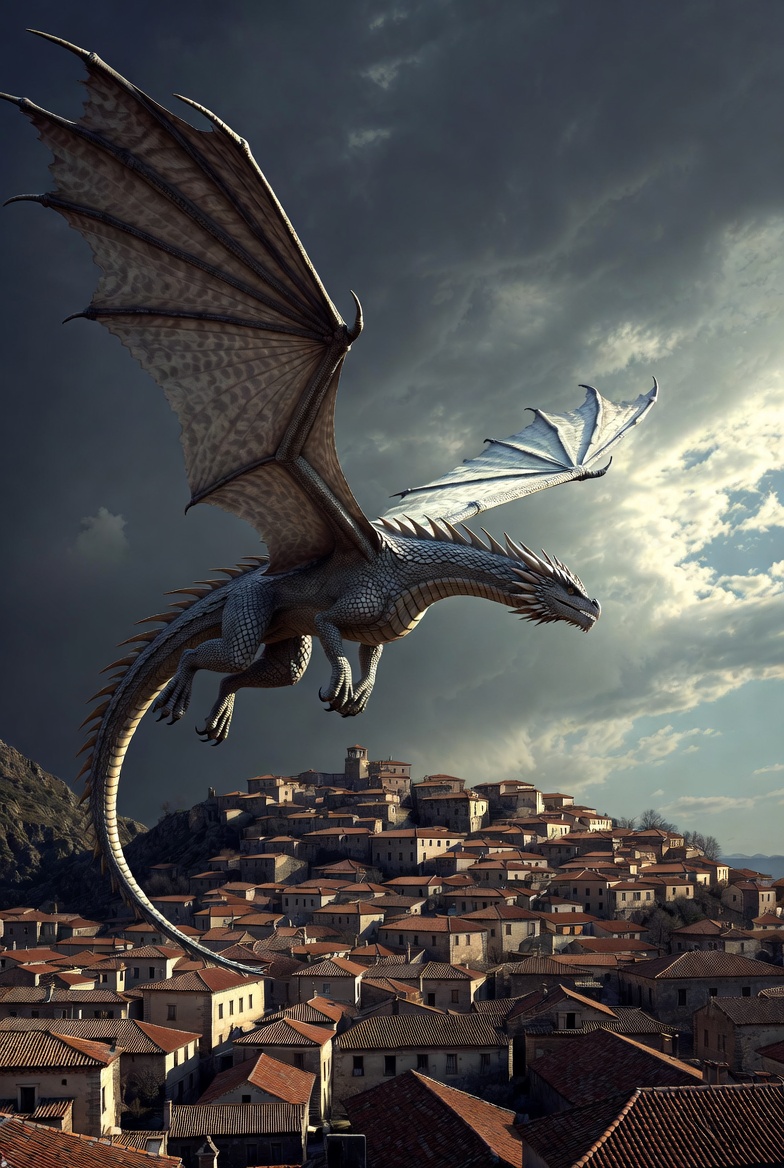 A majestic silver dragon with large wings soars through a cloudy sky above a hillside village. The dragon has detailed scales, sharp claws, and a long tail curling around the terracotta-roofed buildings. Sunlight breaks through the clouds, illuminating the scene.