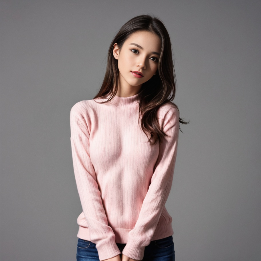Asian, beautiful, blue jeans, cable knit, dark hair, female, gray background, hands clasped, long hair, neutral expression, pink sweater, portrait, pretty, slim, standing, turtleneck, young woman, woman