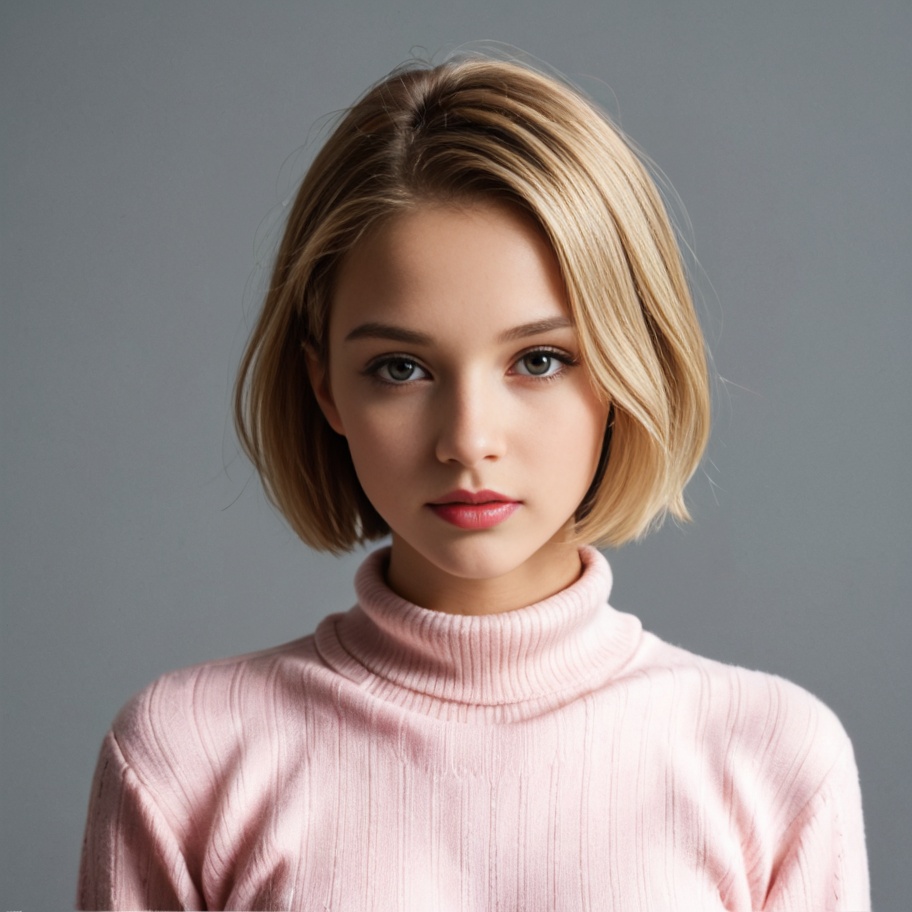 blonde hair, bob haircut, direct gaze, fair skin, female, gray background, headshot, light eyes, pink lips, pink turtleneck, portrait, short hair, straight hair, sweater, young woman, girl