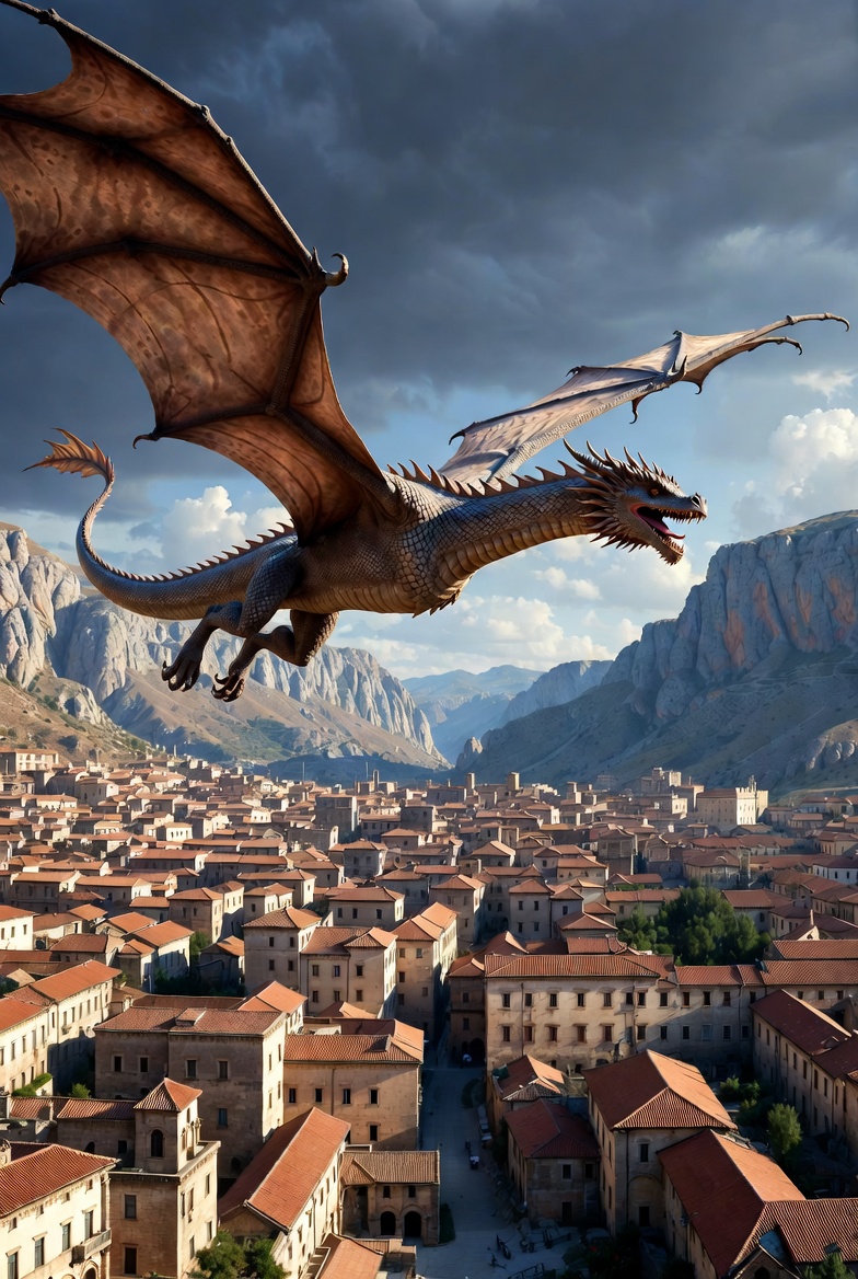 aerial view, beast, brown dragons, claws, clouds, creature, dragon flight, fantasy dragons, fantasy landscape, flying dragons, medieval village, mountains, red roofs, rocky cliffs, scales, stormy sky, terracotta roofs, valley, village, wings, dragons