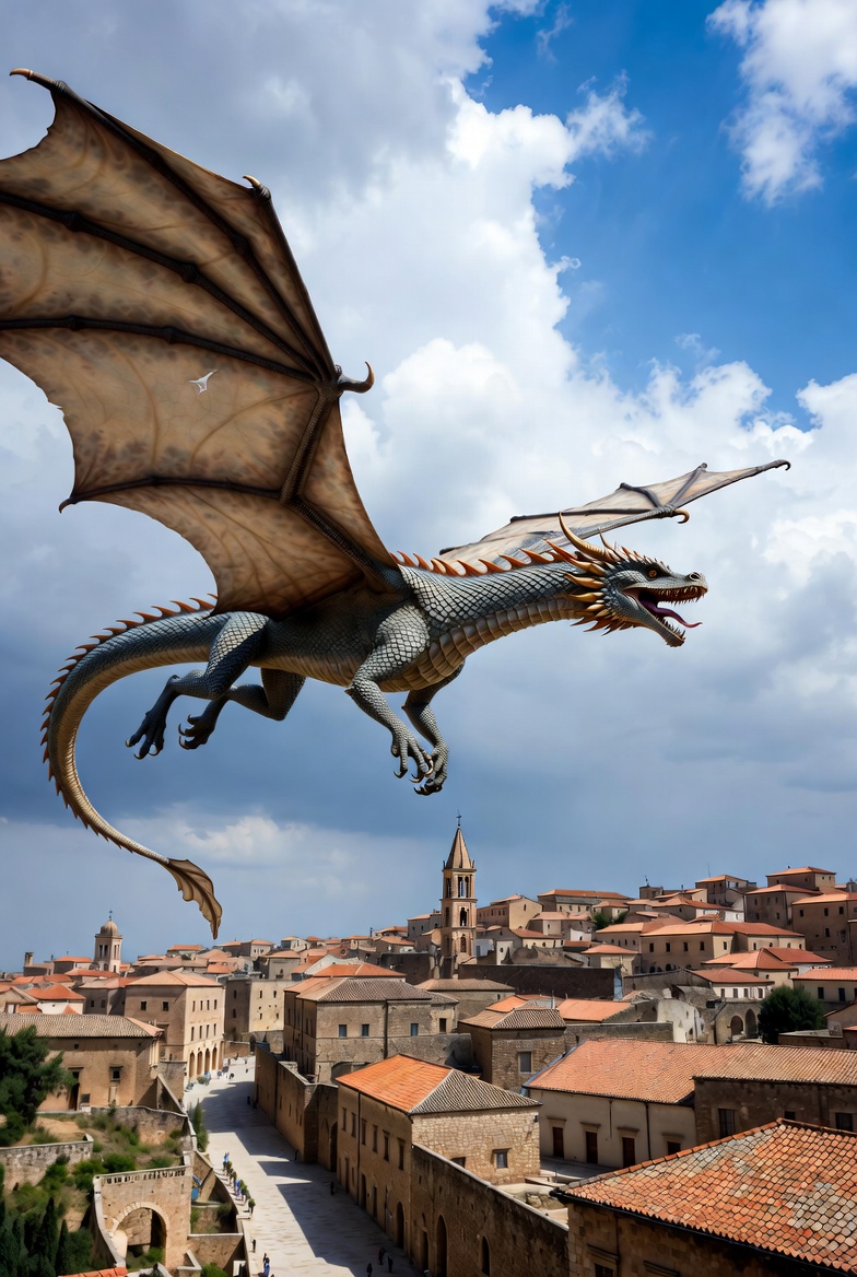 bell tower, blue sky, claws, clouds, fantasy creature, flying, flying dragon, gray dragon, isolated background, medieval village, old town, scales, stone buildings, terracotta roofs, wings, dragon