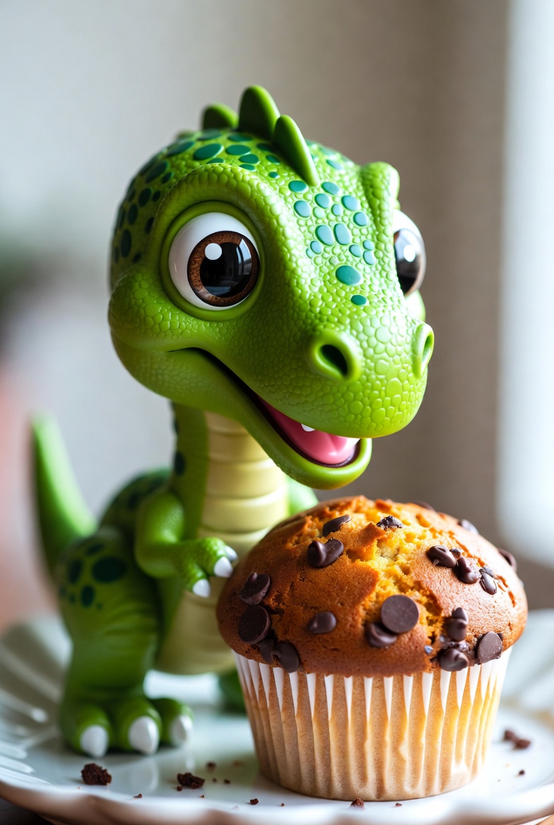 Green dinosaur toy holding muffin