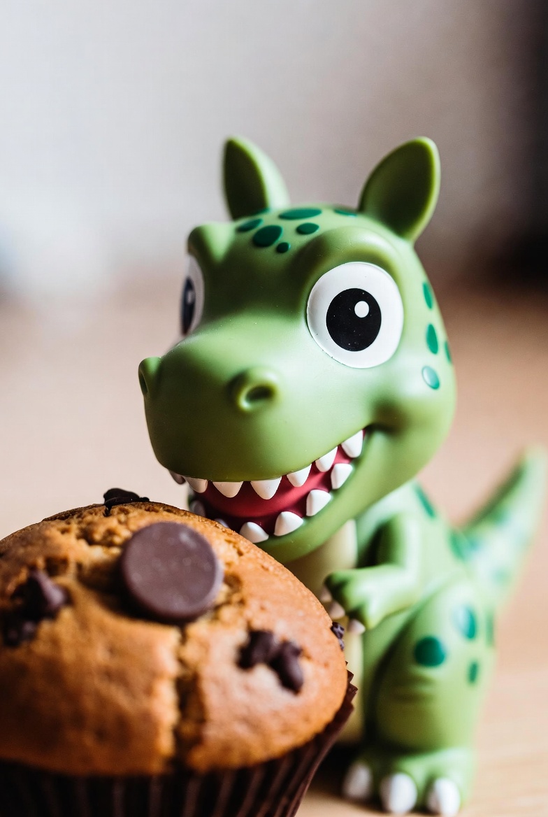 A cute green plastic T-Rex dinosaur toy with big eyes and sharp teeth bites into a chocolate chip muffin. The toy stands on a wooden surface with a white background. Spots and detailed features make the dinosaur appear playful.