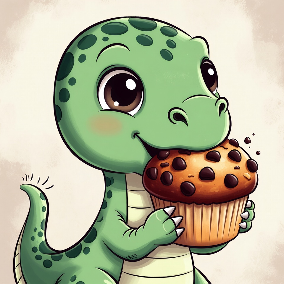 T-Rex, adorable dinosaur, baby dinosaur, big eyes, cartoon dinosaur, chibi dinosaur, chocolate chip muffin, clipart, cute dinosaur, dinosaur, eating muffin, green dinosaur, illustration, isolated background, kawaii, muffin, baby T-Rex