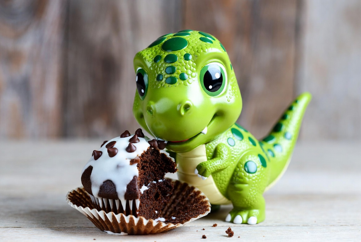 animal, big eyes, chocolate chips, chocolate cupcake, cupcake, cute dinosaur, dinosaur, eating cupcake, frosting, green dinosaur, isolated background, toy, toy dinosaur, wooden background, T-Rex