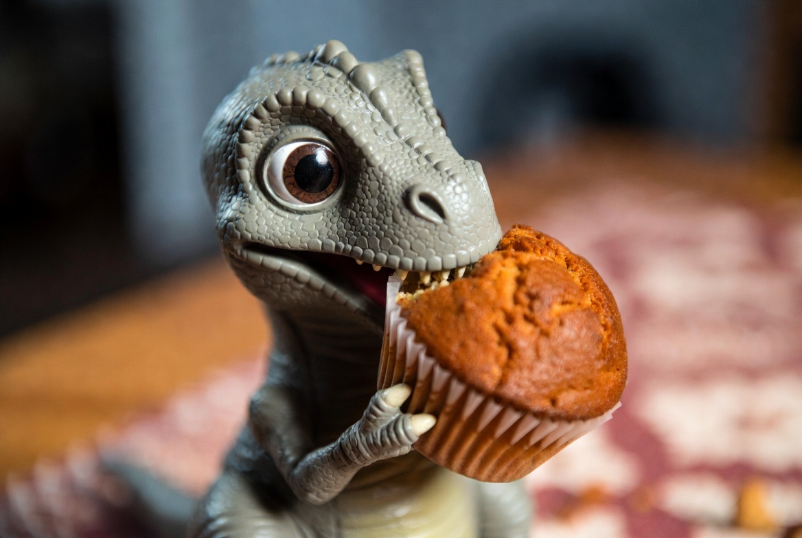 animals, baby dinosaur, big eyes, claws, crumbs, cute dinosaur, dinosaur toy, eating muffin, food, gray T-Rex, isolated background, muffin, realistic toy, red cloth, scales, toy dinosaur, wooden table, T-Rex