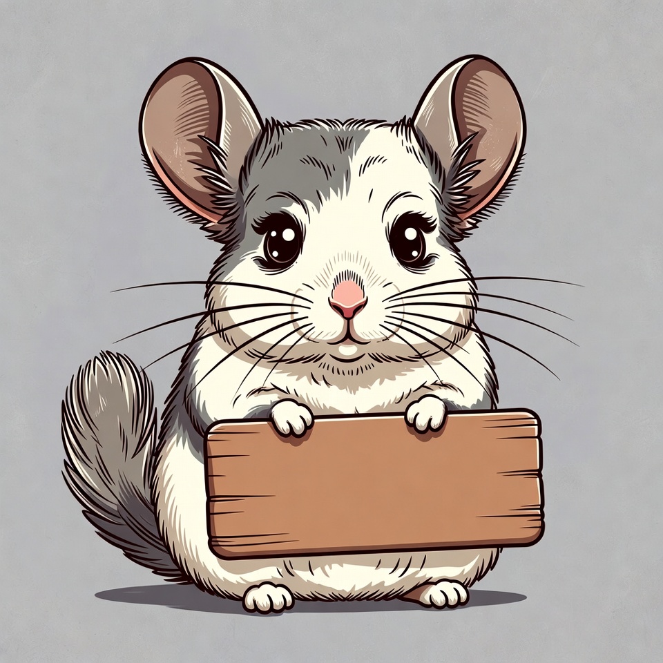 animal, big eyes, blank sign, cartoon chinchilla, clipart, cute chinchilla, fluffy ears, grey fur, holding sign, illustration, isolated background, paws, whiskers, white fur, wooden sign, chinchilla