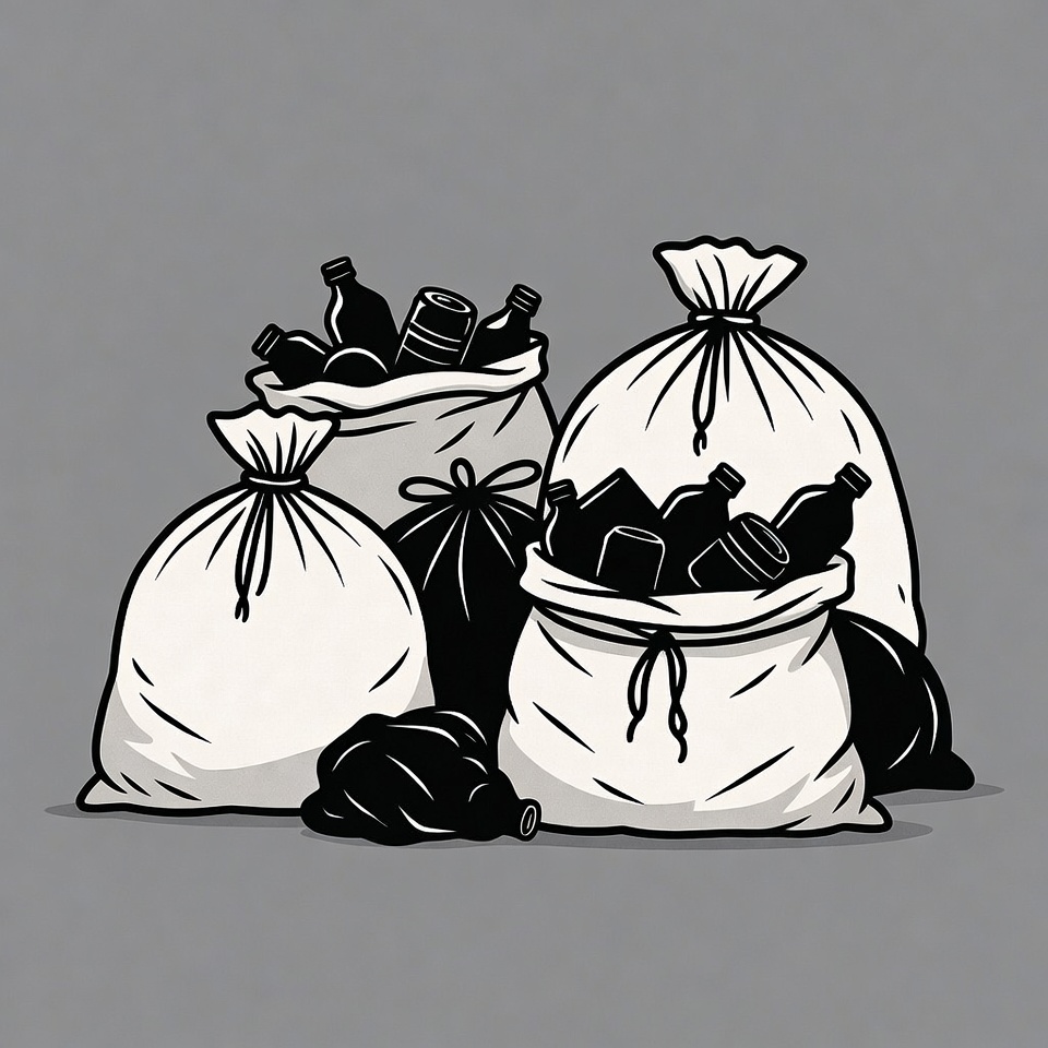 Several white and black trash bags filled with plastic and glass bottles are arranged on a gray background. The bags are tied at the top and some have spilled contents. The illustration is in a simple black and white line art style.