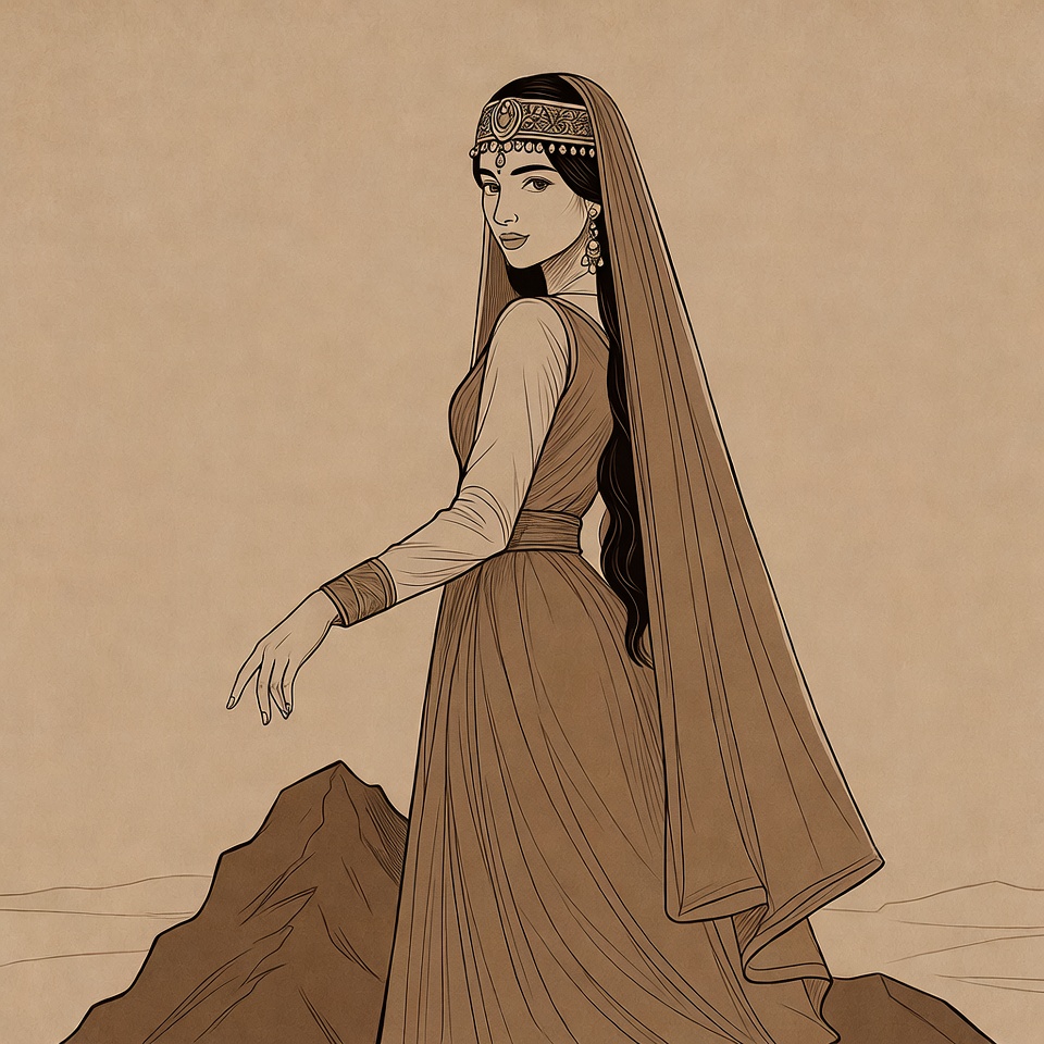 Middle Eastern, artistic drawing, beige dress, cultural attire, desert mountains, elegant pose, fantasy art, female, flowing fabric, hand extended, headpiece, illustration, isolated background, jewelry, line art, long hair, mountains, ornate crown, paper texture, profile view, rocks, serene face, tan background, traditional gown, veil, woman