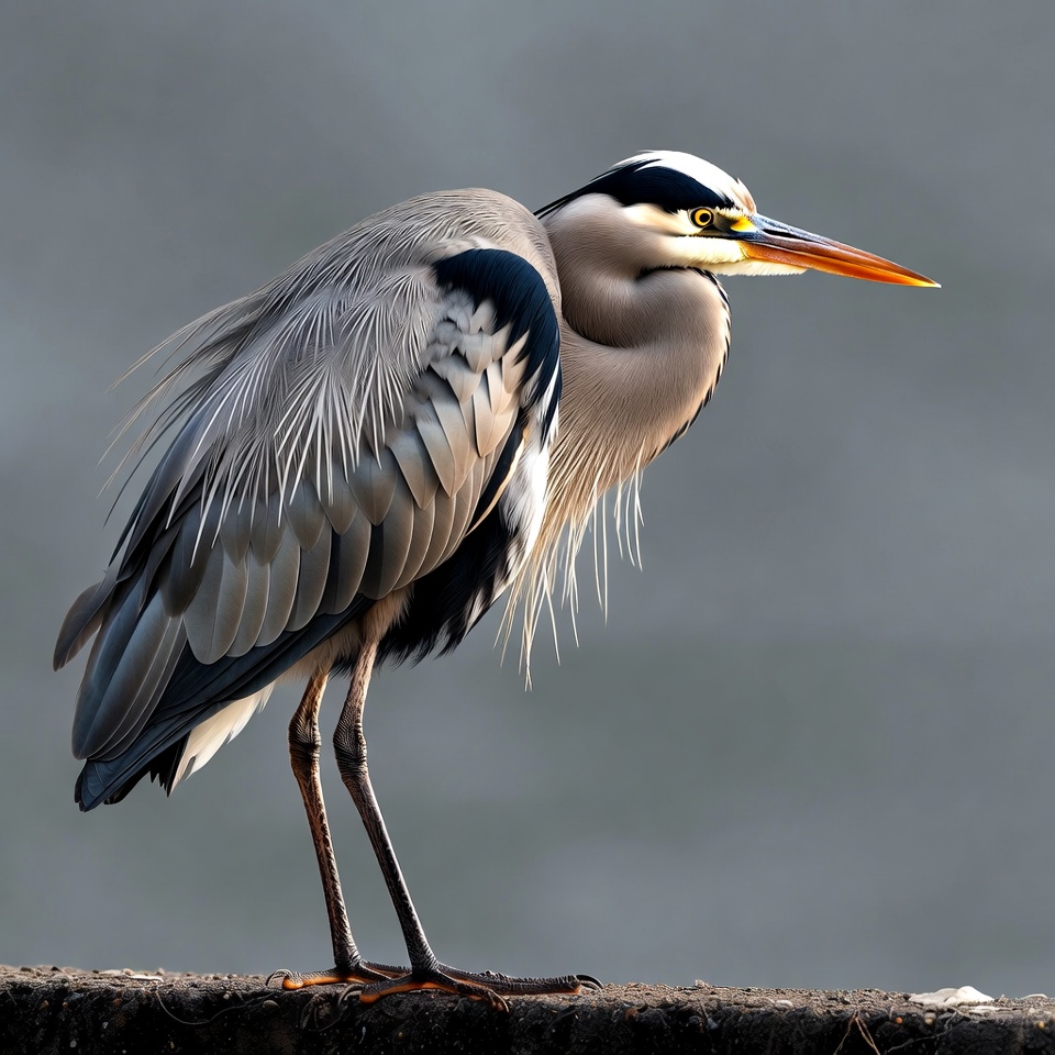 A great blue heron stands on a dark surface with wings slightly spread. It features grey feathers, a black and white striped crown, yellow eyes, and an orange beak. The bird is captured against a soft grey background.