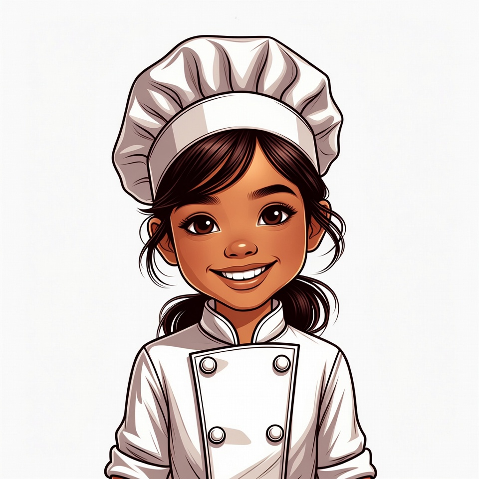 Asian, Asian girl, big eyes, brown hair, cartoon girl, chef outfit, chef uniform, clipart, cute girl, female, girl chef, happy face, illustration, isolated background, kitchen uniform, ponytail, smiling face, smiling girl, white chef hat, young girl, chef girl