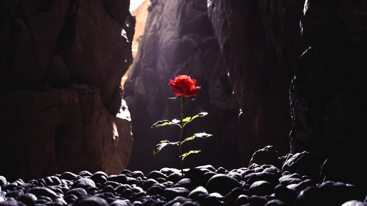 A vibrant red rose grows from a bed of small rocks at the bottom of a narrow, dark rocky canyon. Sunlight beams down from above, illuminating the flower and casting dramatic shadows on the rugged stone walls. The rose stands tall with green leaves and stem contrasting the earthy surroundings.