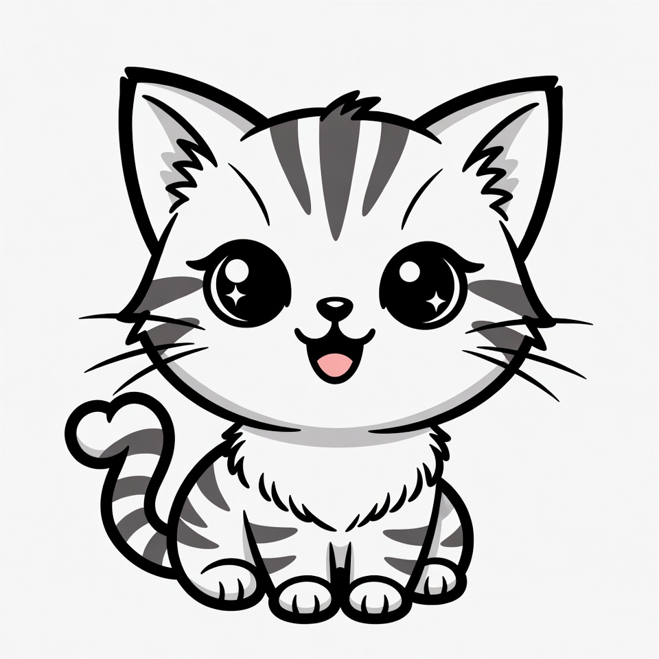 adorable animal, animal clipart, big eyes, black and white, cartoon cat, cat ears, cat illustration, chibi cat, fluffy fur, happy kitten, heart tail, isolated background, kawaii kitten, kitten drawing, line art, manga style, smiling cat, striped cat, tabby cat, whiskers, cute kitten