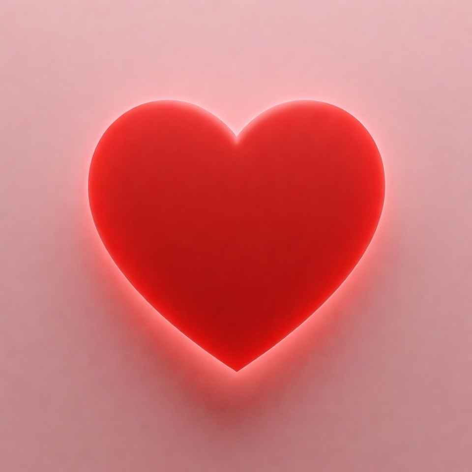 A vibrant red heart shape glows with a glossy, 3D effect against a soft pink background. The heart features smooth edges and a subtle neon-like illumination. It is centered and isolated on the plain pastel backdrop.