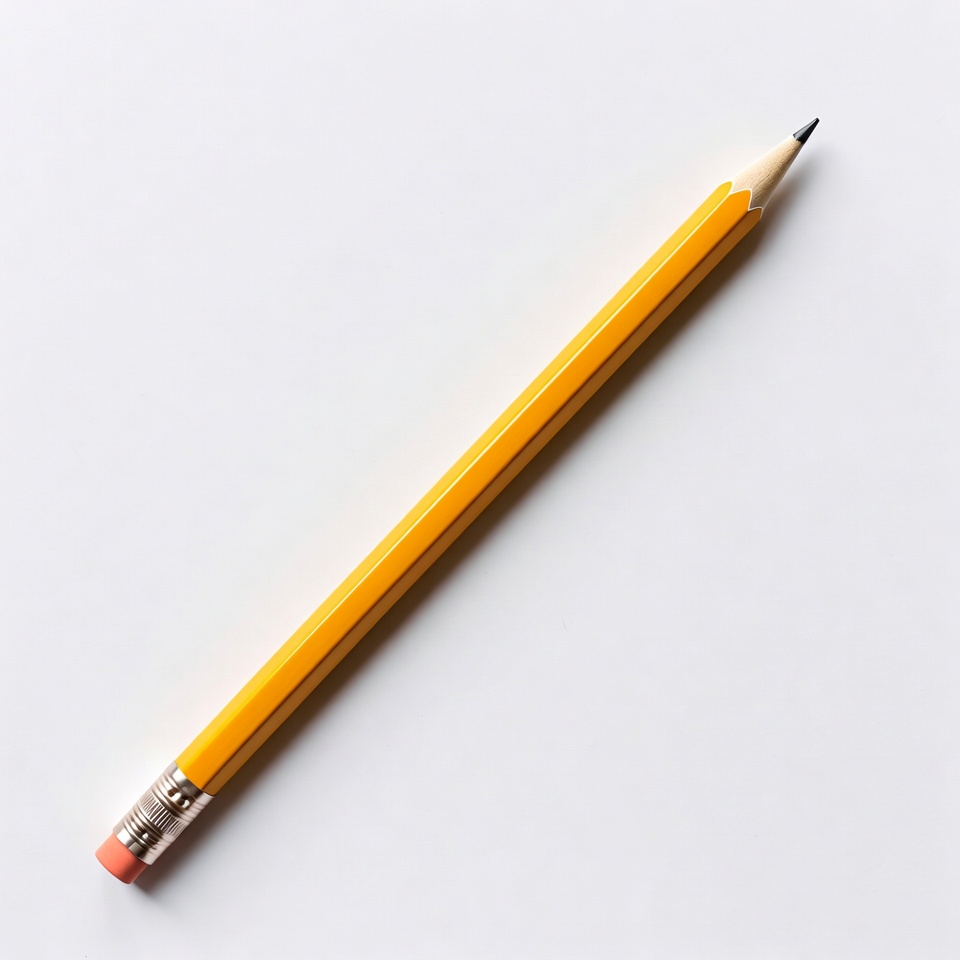 A classic yellow pencil with a pink eraser and black graphite tip lies horizontally on a plain white background. The pencil features silver ferrule and standard hexagonal shape. It is sharply focused and isolated for clear visibility.
