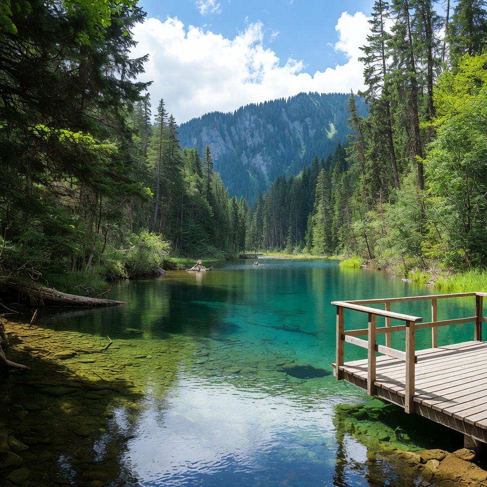 alpine lake, blue sky, clear water, clouds, emerald water, evergreen trees, fir trees, forest lake, green trees, hiking spot, landscape, lush forest, mountain lake, mountains, natural beauty, nature, outdoors, pine forest, pristine water, reflection, rocky mountains, scenery, sunny day, tranquil lake, wilderness, wooden dock, wooden pier, turquoise lake